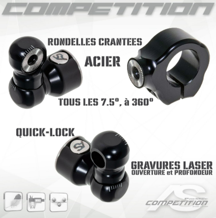 Crantage acier tous les 7.5°, sur 360°, en ouverture et en profondeur.