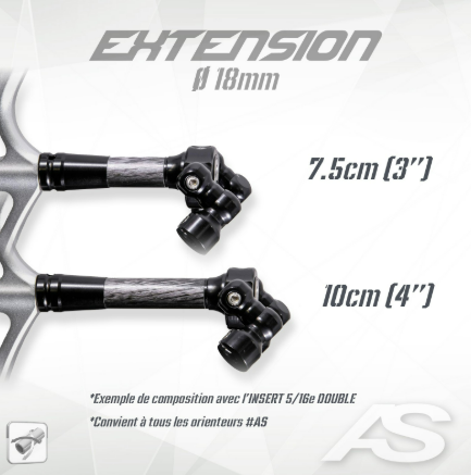 Le modèle EXTENSION COMPETITION Ø18 est une extension pour stabilisation. Elle possède un corps en aluminium dans une enveloppe de carbone pour supporter les charges d’une stabilisation complète avec ou sans VBAR. Elle se fixe avant ou après un VBAR ou un ONE-BAR, selon l’équilibre souhaité.