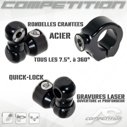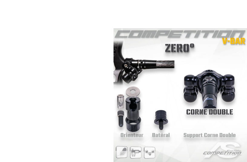 Inclus : Système complet DOUBLE, corne latérale crantée acier, orienteur central au choix (5/16e ; 0°; Réglable 2-7-12°)